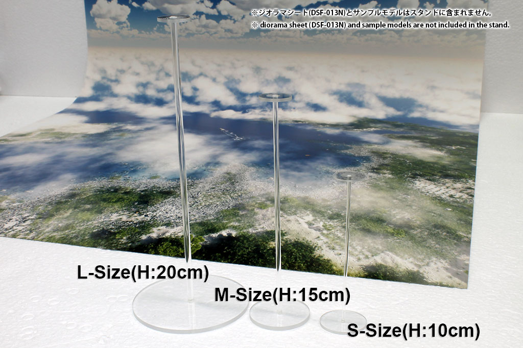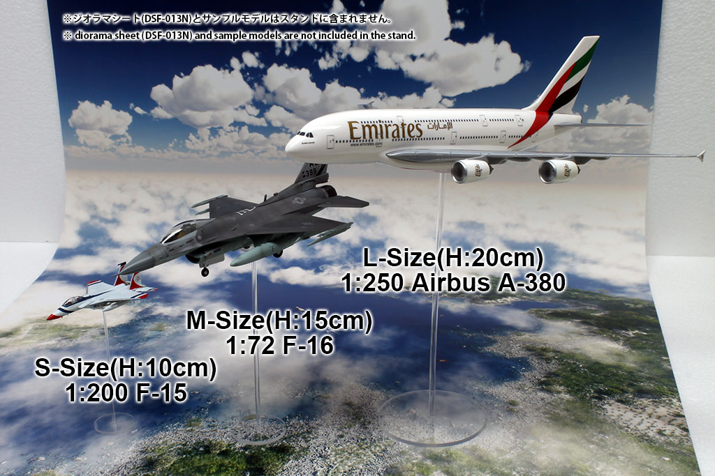 It is a convenient Hakoniwagiken original transparent acrylic stand, such as during shooting of the aircraft flight model. Height are approximate. S size (height 10cm) is 1/144 and 1/200 fighters and 1/500 airliner. M size (height 15cm) such as 1/72 fighters and 1/400 airliner, L size (height 20cm ) such as 1/48 fighters and 1/250 airliner will correspond.