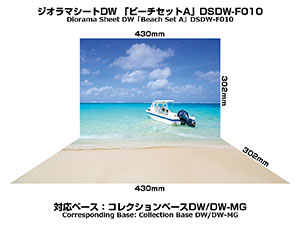 コレクションベースDW(DW-MG)で利用可能なジオラマシートDWシリーズのビーチセットAです。目安として1/12〜1/6サイズのフィギュアでお楽しみいただけ、余裕あるサイズを生かして1/12〜1/8などのサイズでは立体的な展示ディスプレイも可能です。対応ベースは別売となります。両面印刷2枚組で、表と裏がそれぞれベースと背景になっており、1パターンが楽しめます。コレクションベースに付属の極小固定マグネットを利用して、簡単に設置が可能です。お気に入りのシーンが完成したら、別売のUVカットアクリルカバーで紫外線・ホコリから展示物を守る高機能なディスプレイケースへ発展可能です。材質はこれまでの従来のジオラマシート同様のノーマルタイプで、コーティング無しとなります。 |