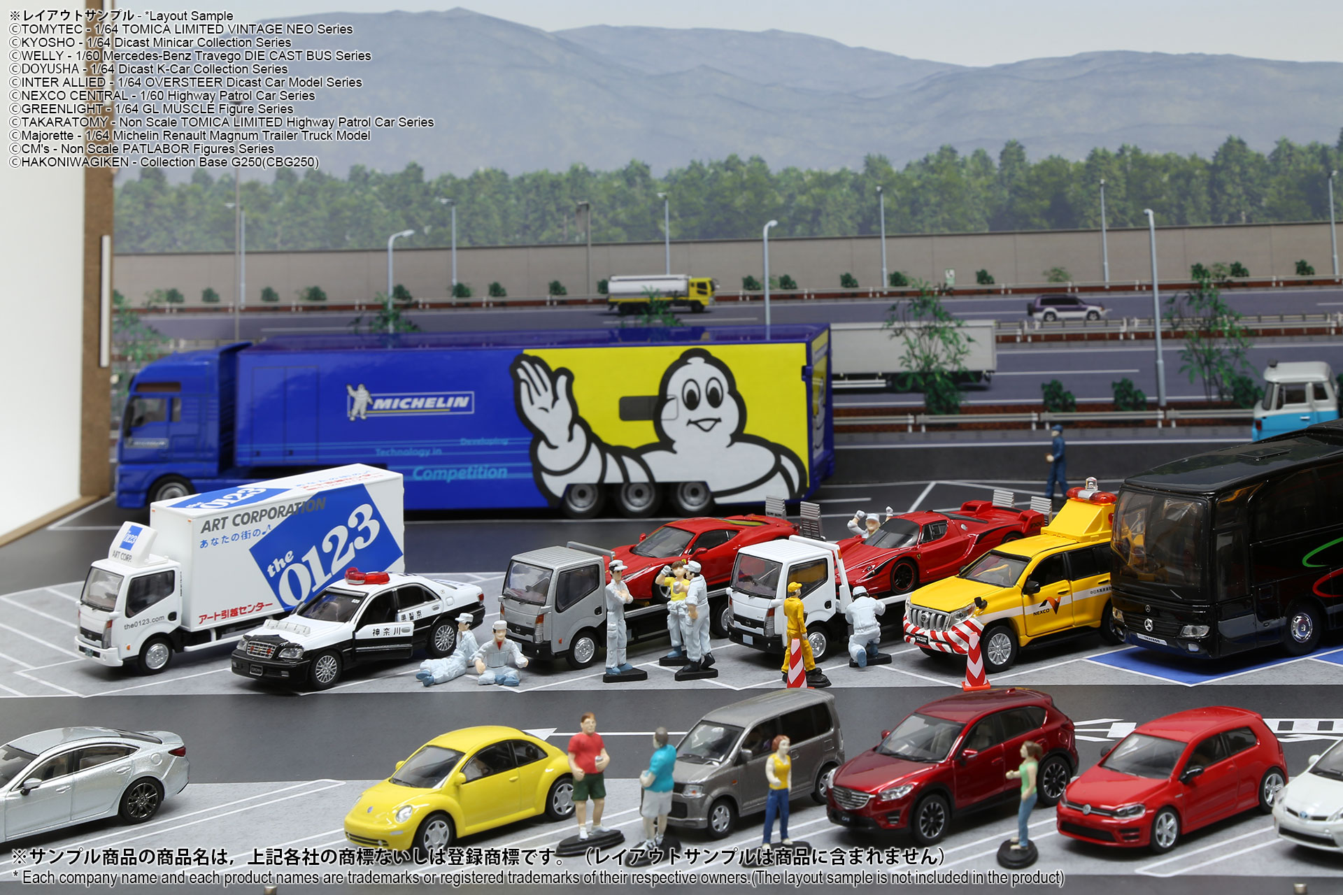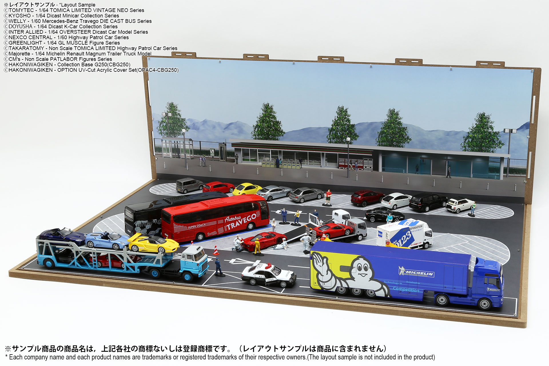 ベース表面は駅前ターミナル、ベース裏面はSA/PAの2パターンが印刷されたHGタイプのシート1枚と、前後2パターンの厚口マットコート紙タイプの背景シート4パターンが付属した1/64スケール対応のジオラマシートG250タイプです。ベースシートと背景シートの組み合わせで、4パターンからお好みで選んでご利用いただけます。ベースシートは耐久性向上と反射防止効果を備えたマットPPコーティングのHGタイプを採用しております。専用のコレクションベースG250に対応しますが、シート単独でもご自分で背景シートを固定することでご利用可能です。 |