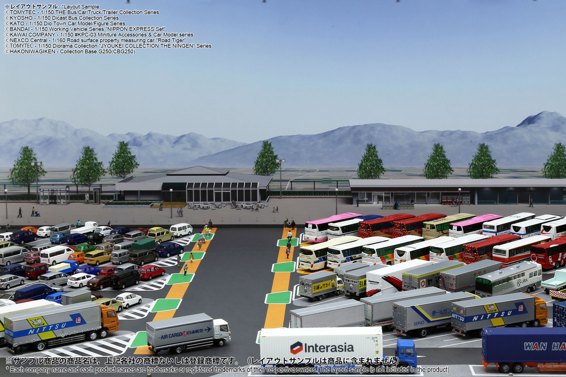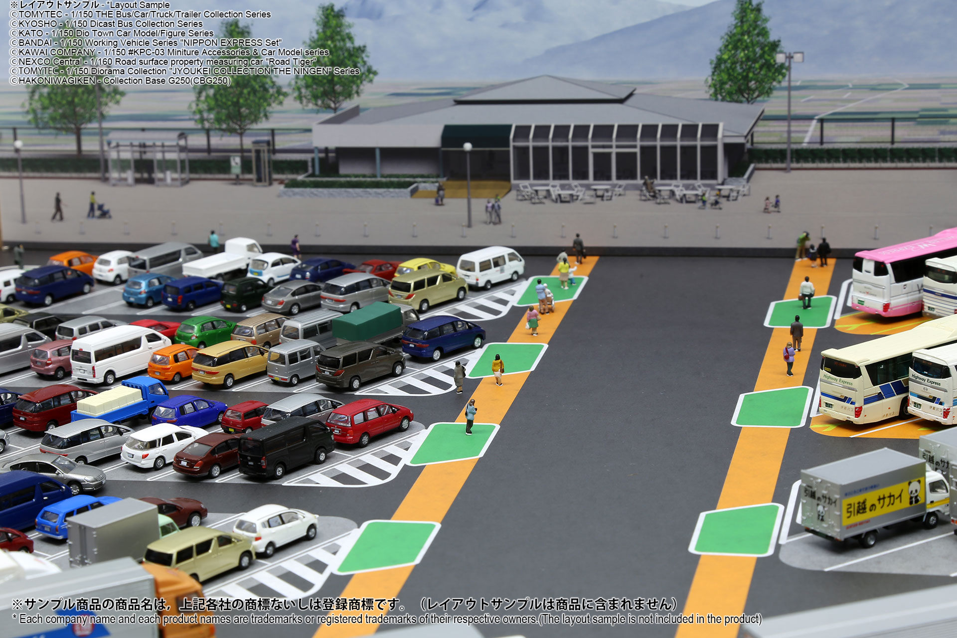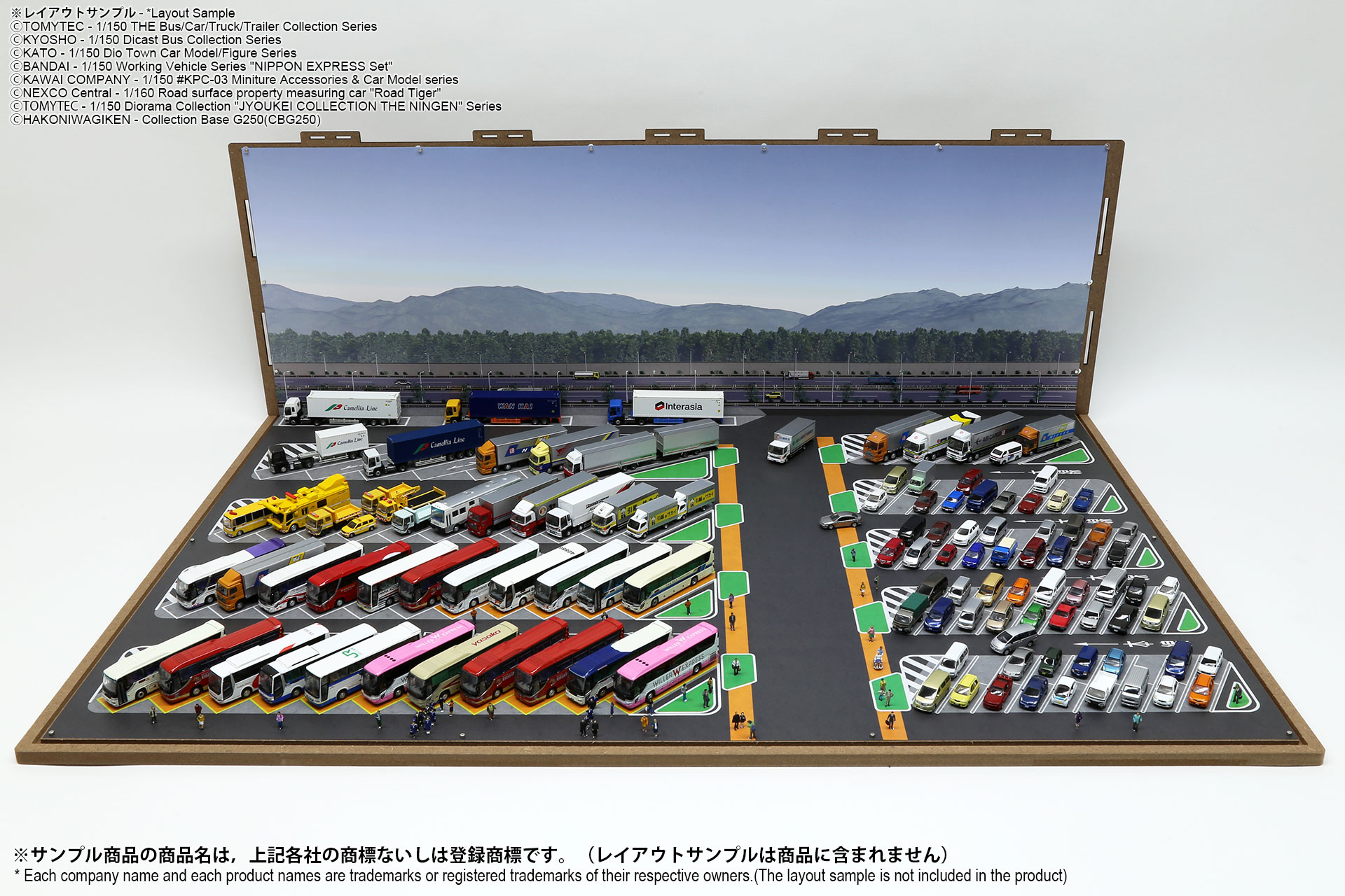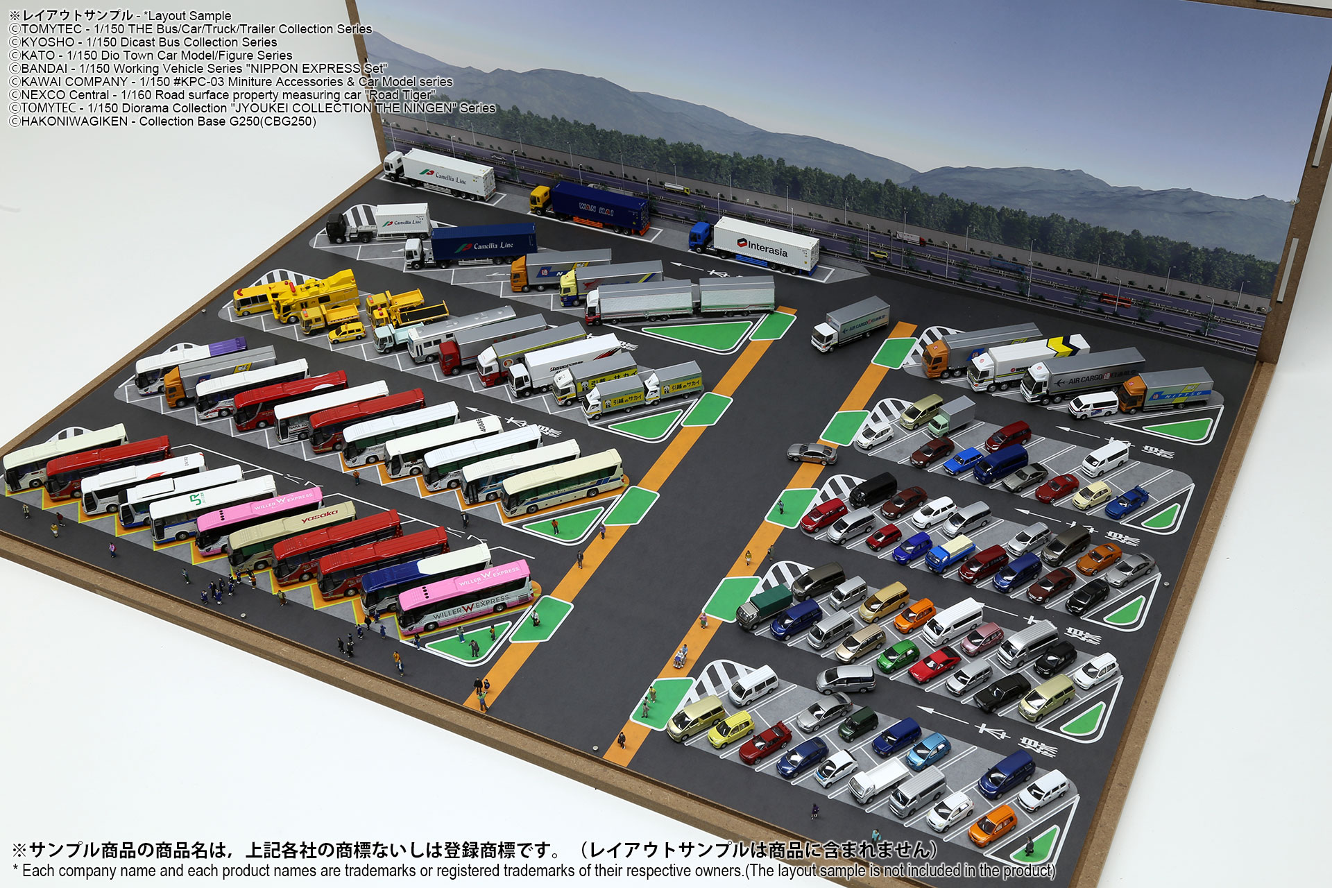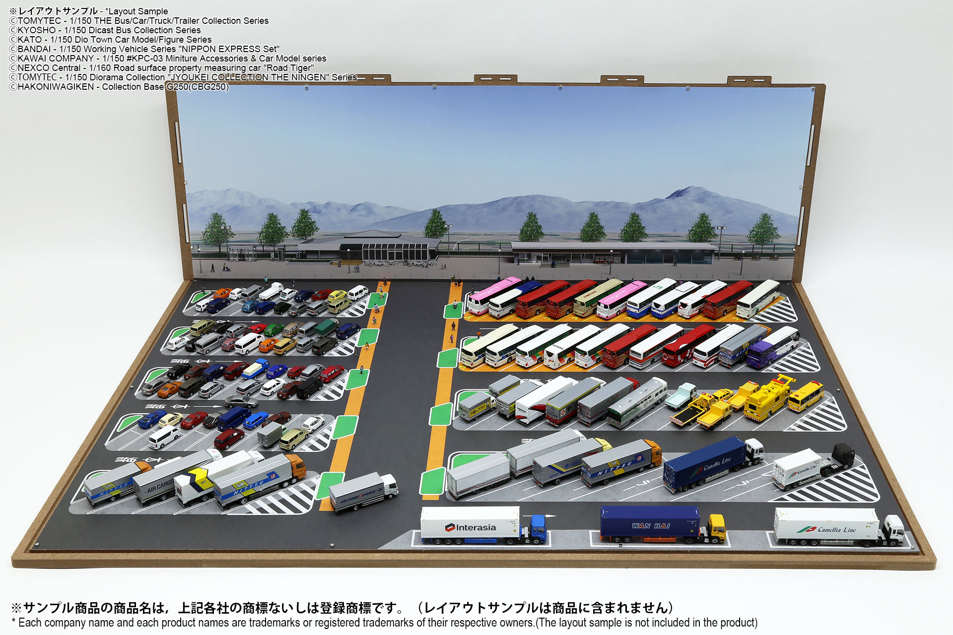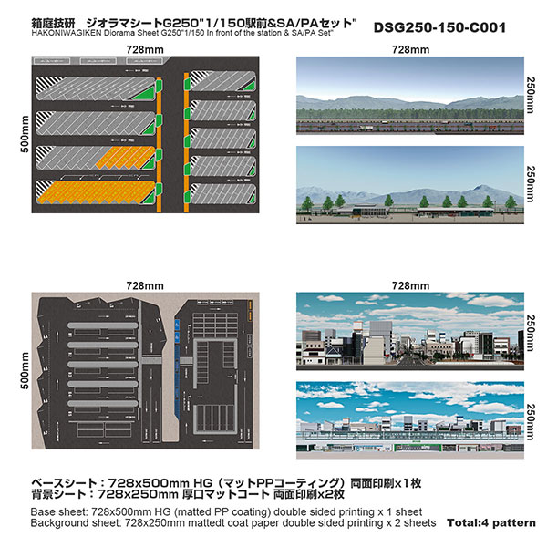 ベース表面は駅前ターミナル、ベース裏面はSA/PAの2パターンが印刷されたHGタイプのシート1枚と、前後2パターンの厚口マットコート紙タイプの背景シート4パターンが付属した1/150スケール対応のジオラマシートG250タイプです。ベースシートと背景シートの組み合わせで、4パターンからお好みで選んでご利用いただけます。ベースシートは耐久性向上と反射防止効果を備えたマットPPコーティングのHGタイプを採用しております。専用のコレクションベースG250に対応しますが、シート単独でもご自分で背景シートを固定することでご利用可能です。 |