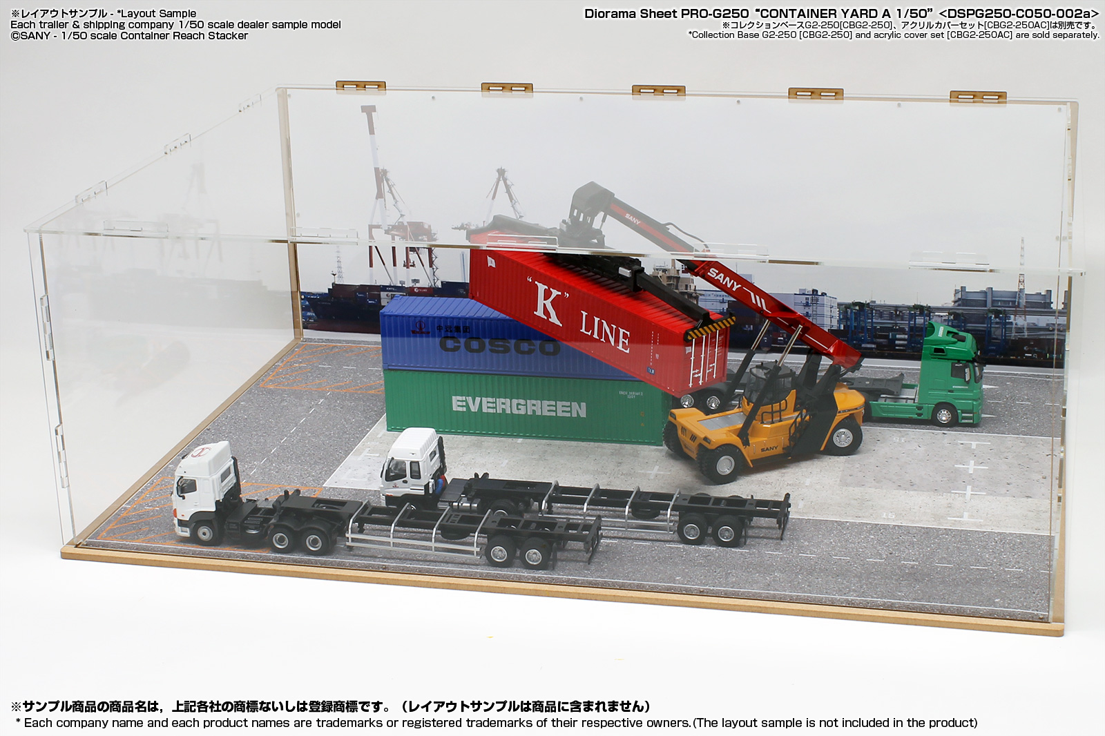 リアルな無反射のジオラマシートPRO素材を採用したコンテナヤード情景のジオラマシートです。サイズはW728xD500xH250mmサイズのコレクションベースG250に対応いたしますが、壁に接したテーブルなどに設置してもご利用いただけます。コレクションベースを利用される際は、別売のUVカットアクリルカバーセットもご利用いただけます。 |