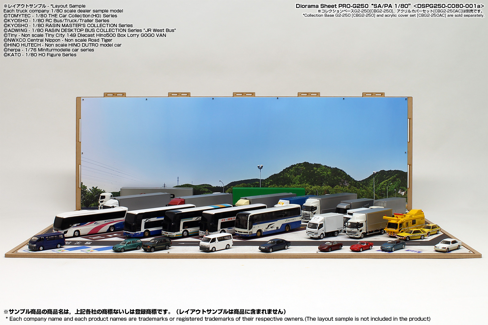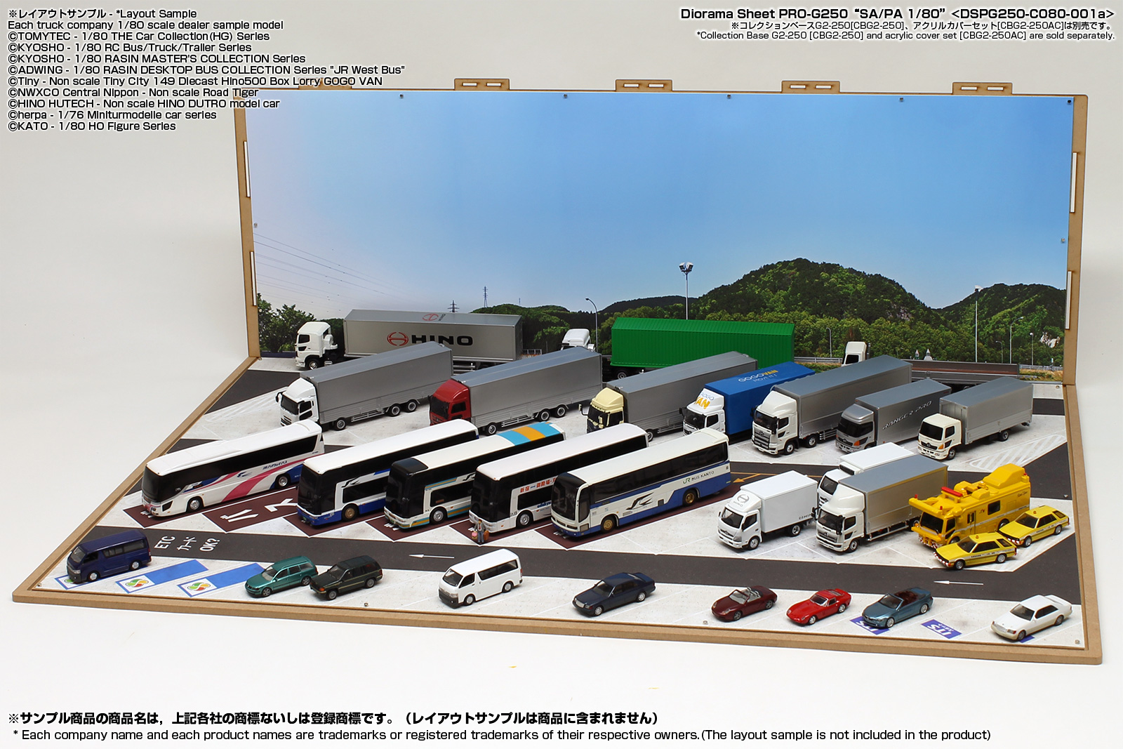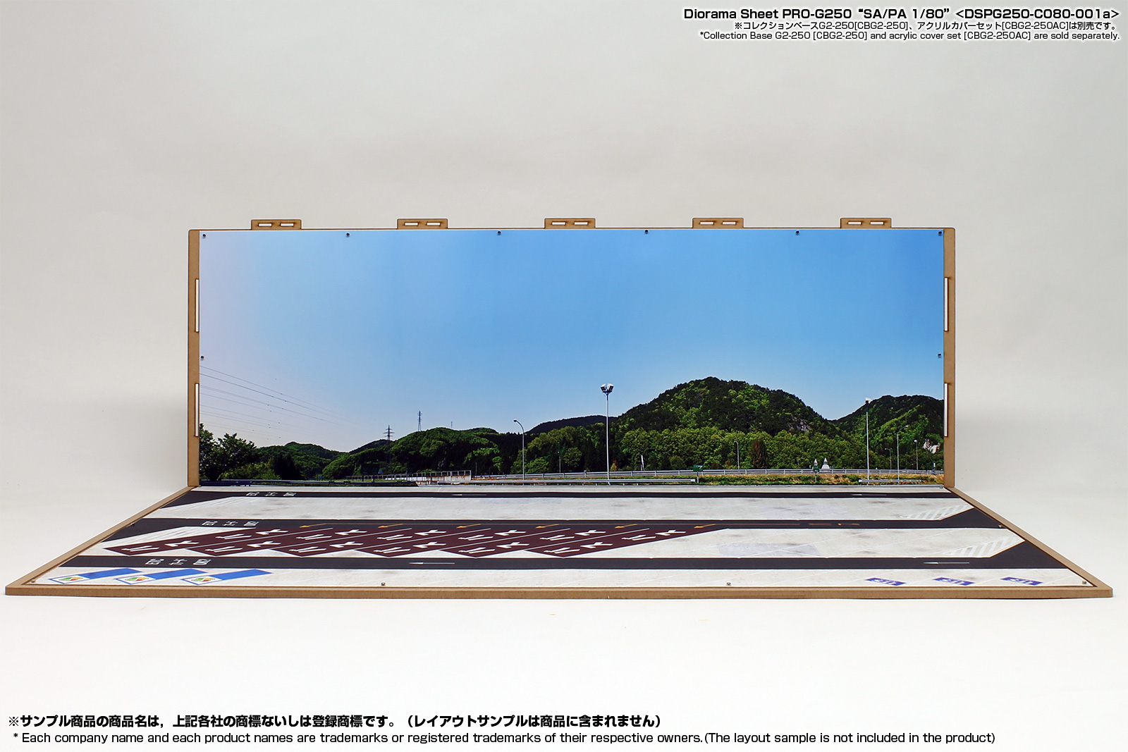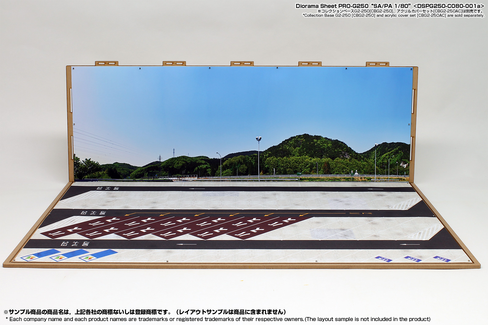 リアルな無反射のジオラマシートPRO素材を採用したSA/PA情景のジオラマシートです。サイズはW728xD500xH250mmサイズのコレクションベースG250に対応いたしますが、壁に接したテーブルなどに設置してもご利用いただけます。コレクションベースを利用される際は、別売のUVカットアクリルカバーセットもご利用いただけます。 |