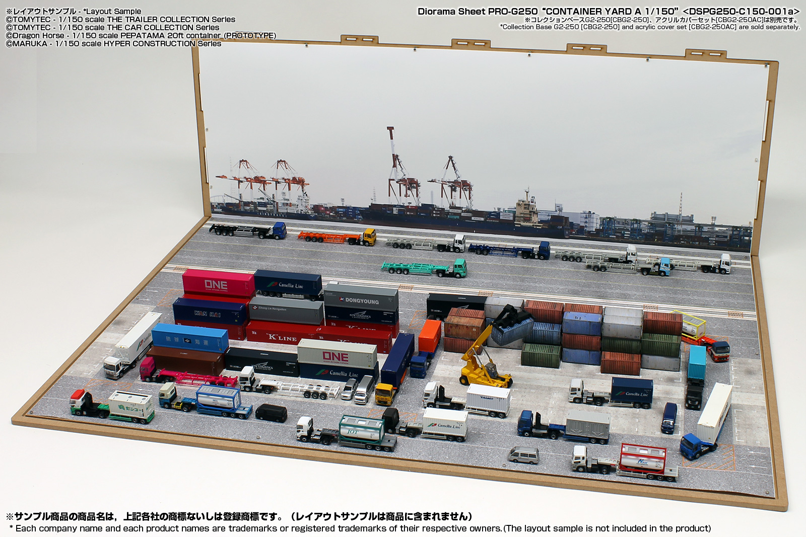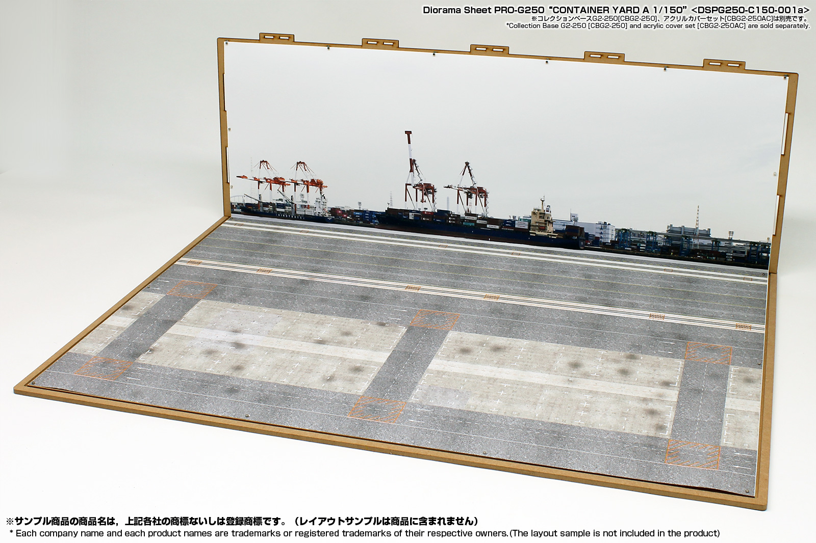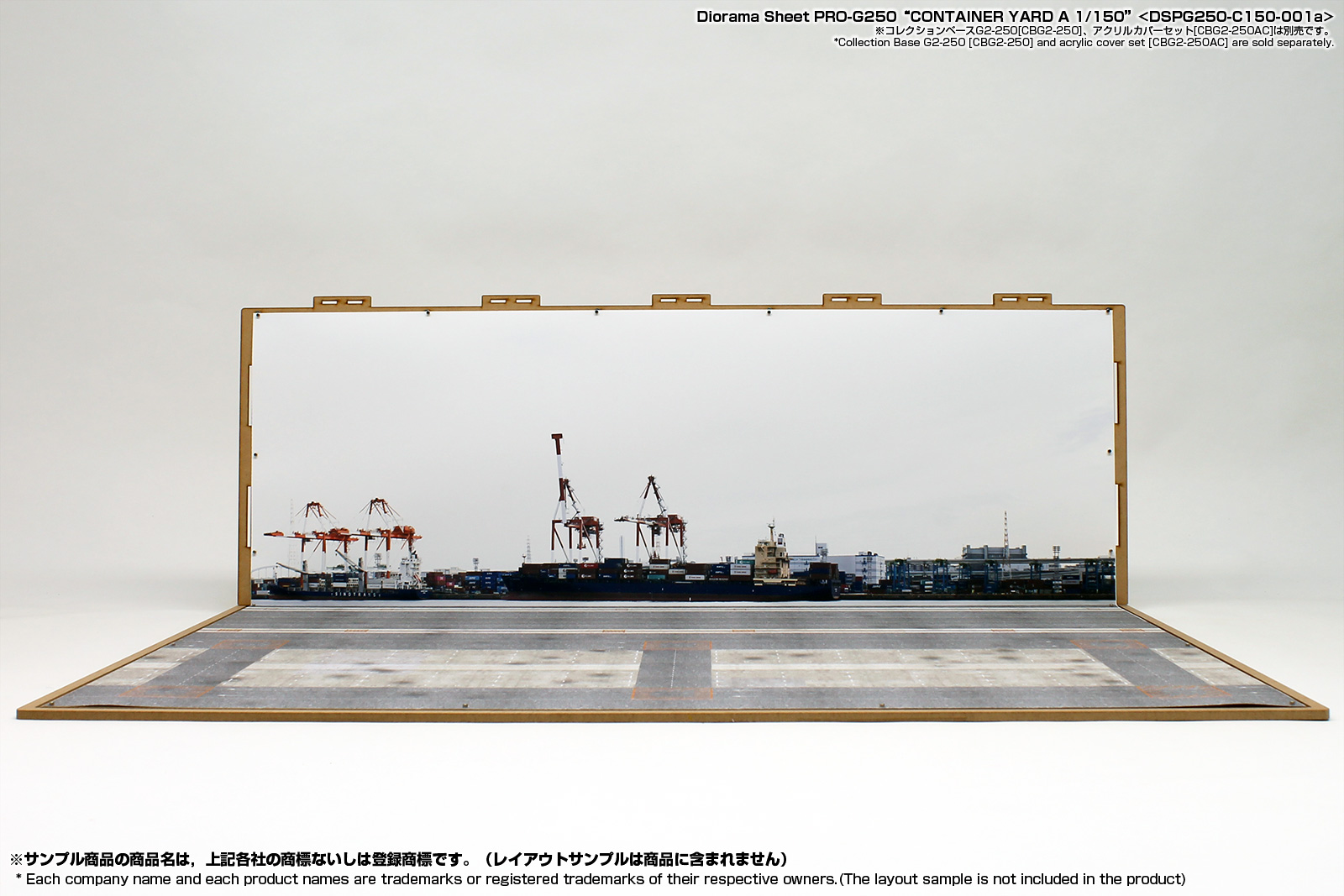 リアルな無反射のジオラマシートPRO素材を採用したコンテナヤード情景のジオラマシートです。サイズはW728xD500xH250mmサイズのコレクションベースG250に対応いたしますが、壁に接したテーブルなどに設置してもご利用いただけます。コレクションベースを利用される際は、別売のUVカットアクリルカバーセットもご利用いただけます。 |