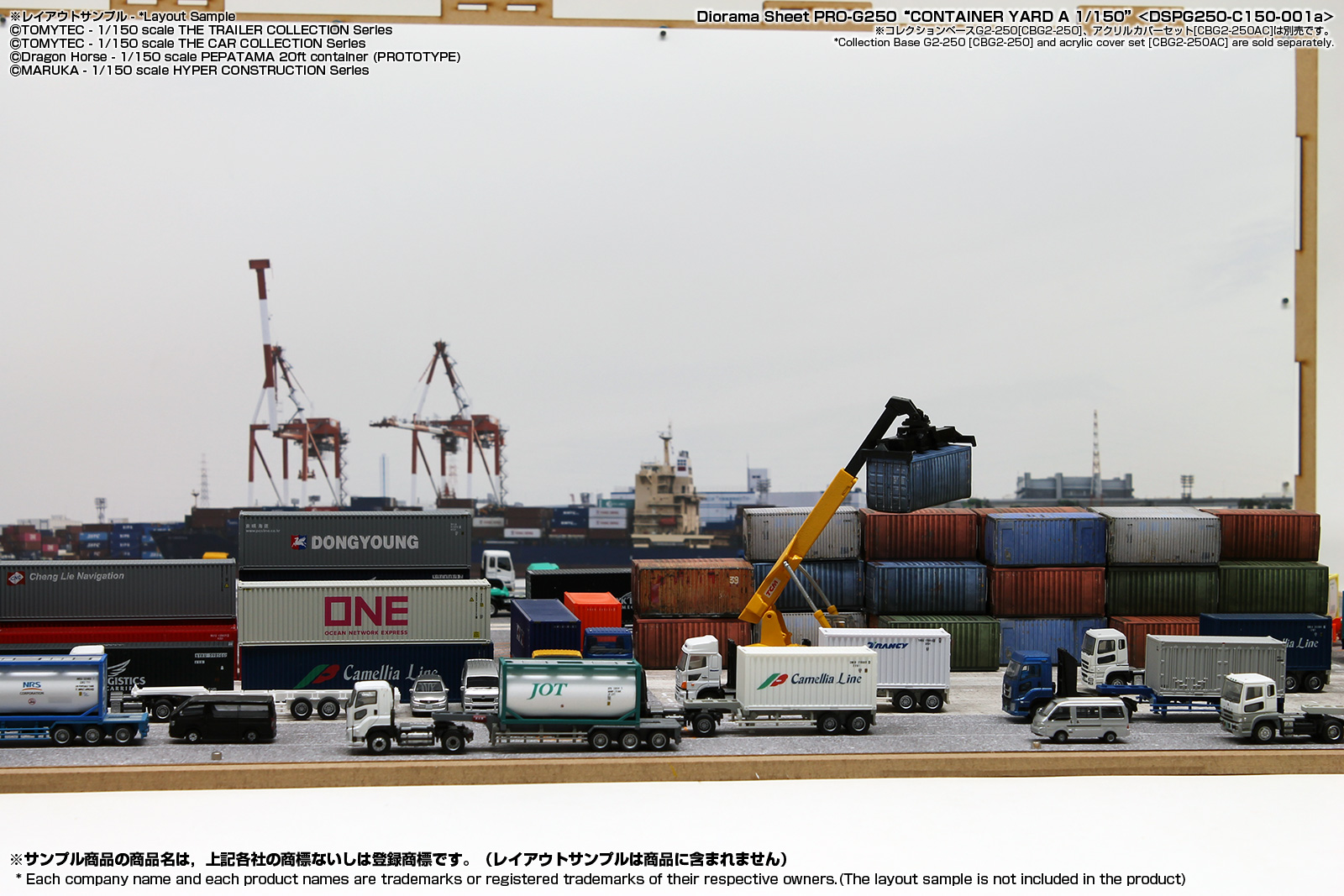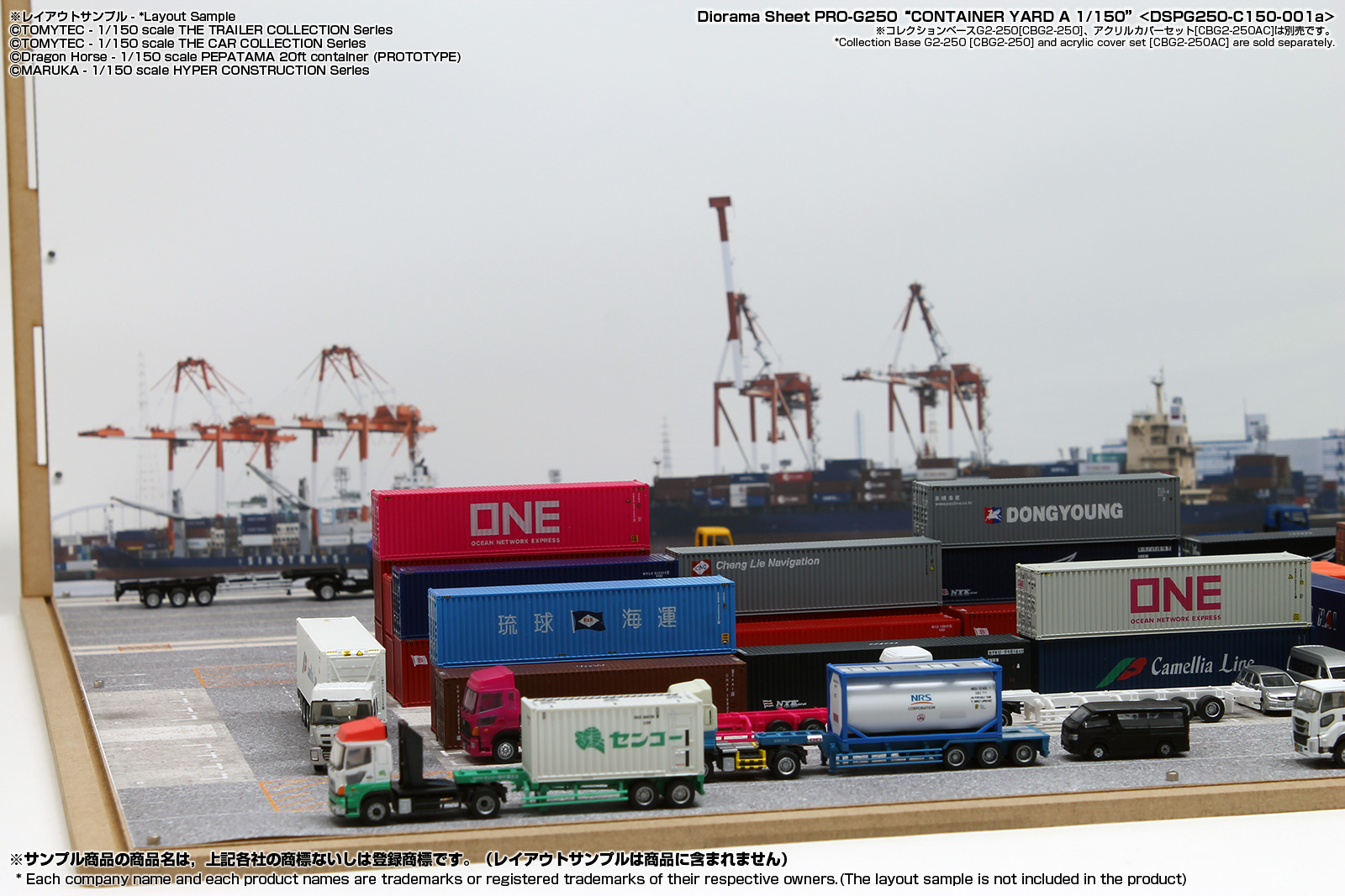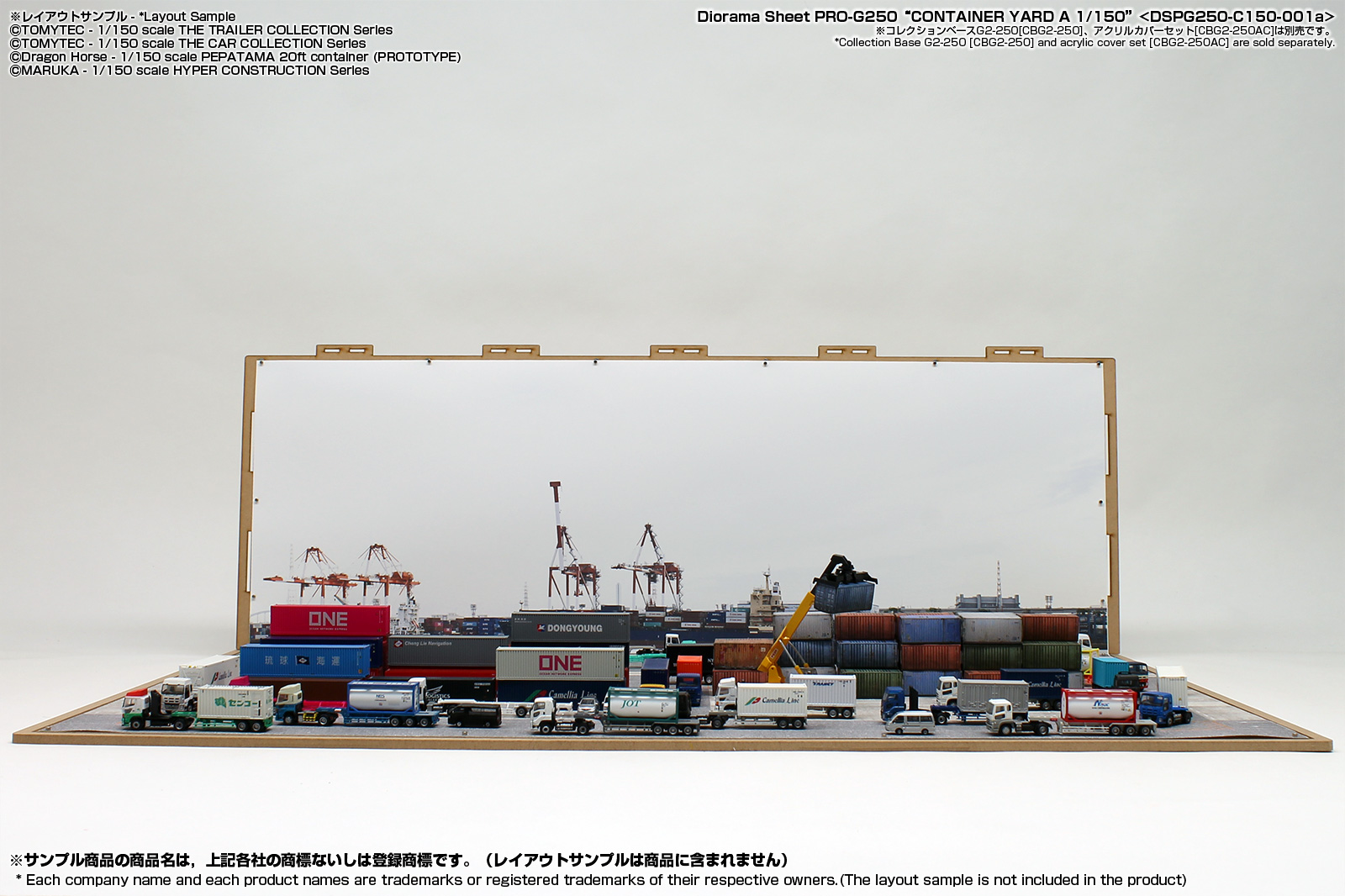 リアルな無反射のジオラマシートPRO素材を採用したコンテナヤード情景のジオラマシートです。サイズはW728xD500xH250mmサイズのコレクションベースG250に対応いたしますが、壁に接したテーブルなどに設置してもご利用いただけます。コレクションベースを利用される際は、別売のUVカットアクリルカバーセットもご利用いただけます。 |
