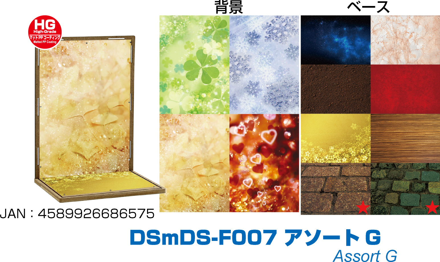 コレクションベースDSシリーズで利用可能なアソートセットです。目安としておよそ1/12〜1/6サイズのフィギュアでお楽しみいただけます。対応ベースは別売となります。両面厚口印刷のマットPPコーティングが施されたHG(High Grade)タイプで、背景4パターン、ベース8パターンにてお楽しみいただけます。コレクションベースに付属の極小固定マグネットを利用して、簡単に設置が可能です。お気に入りのシーンが完成したら、別売のUVカットアクリルカバーで紫外線・ホコリから展示物を守る高機能なディスプレイケースへ発展可能です。 |