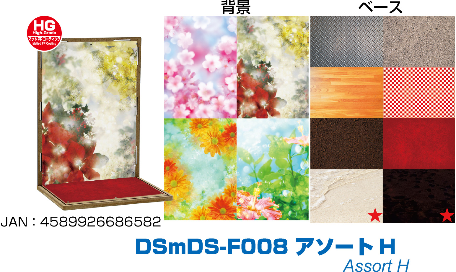 コレクションベースDSシリーズで利用可能なアソートセットです。目安としておよそ1/12〜1/6サイズのフィギュアでお楽しみいただけます。対応ベースは別売となります。両面厚口印刷のマットPPコーティングが施されたHG(High Grade)タイプで、背景4パターン、ベース8パターンにてお楽しみいただけます。コレクションベースに付属の極小固定マグネットを利用して、簡単に設置が可能です。お気に入りのシーンが完成したら、別売のUVカットアクリルカバーで紫外線・ホコリから展示物を守る高機能なディスプレイケースへ発展可能です。 |