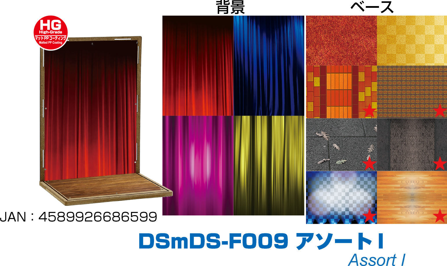コレクションベースDSシリーズで利用可能なアソートセットです。目安としておよそ1/12〜1/6サイズのフィギュアでお楽しみいただけます。対応ベースは別売となります。両面厚口印刷のマットPPコーティングが施されたHG(High Grade)タイプで、背景4パターン、ベース8パターンにてお楽しみいただけます。コレクションベースに付属の極小固定マグネットを利用して、簡単に設置が可能です。お気に入りのシーンが完成したら、別売のUVカットアクリルカバーで紫外線・ホコリから展示物を守る高機能なディスプレイケースへ発展可能です。 |