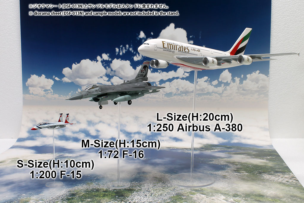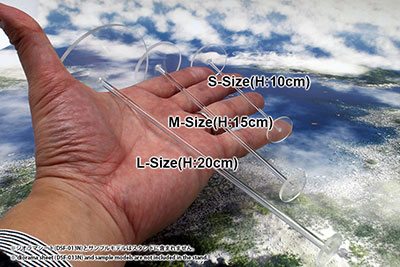 航空機フライトモデルの撮影時などに便利な箱庭技研オリジナルの透明アクリルスタンドです。高さは概算です。Sサイズ(高さ10cm)は1/144や1/200戦闘機や1/500旅客機など、Mサイズ(高さ15cm)は1/72戦闘機や1/400旅客機など、Lサイズ(高さ20cm)は1/48戦闘機や1/250旅客機などが対応します。