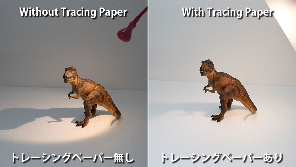 デフューザーを使うと、コントラストが抑えられて、写真の写りがワンラックアップしたような感じになります。人間の目に比べてカメラのダイナミックレンジ(識別可能な明るさの最小値と最大値の比率)は低いため、人間の目では認識できる影の部分のディテールがカメラで撮った写真になると黒くつぶれて認識できない、というケースが良くあります。そういった写真は「いかにも簡単に写真で撮りました」という感じのイメージになってしまいがちです。トレーシングペーパーを使用してデフューザーとすることでコントラストが抑えられ、影の部分のディテールも認識できるために、より人間の目で見た感じに近い自然な画像となるため、「きれいな写真だな」と感じやすくなります。 |