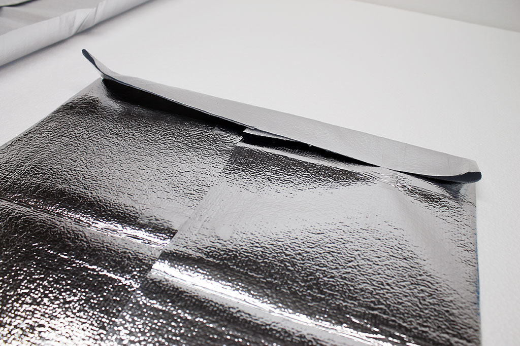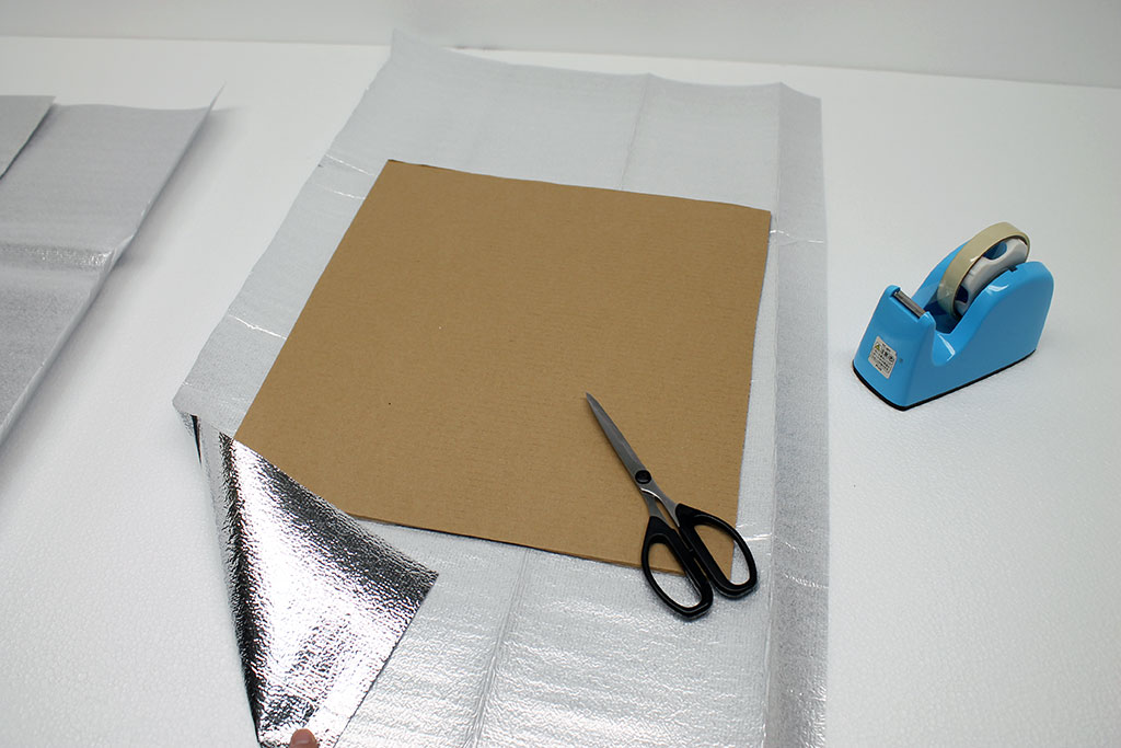 板段ボールを包むようにして断熱シートをテープで留めるだけで簡単に完成します。 |