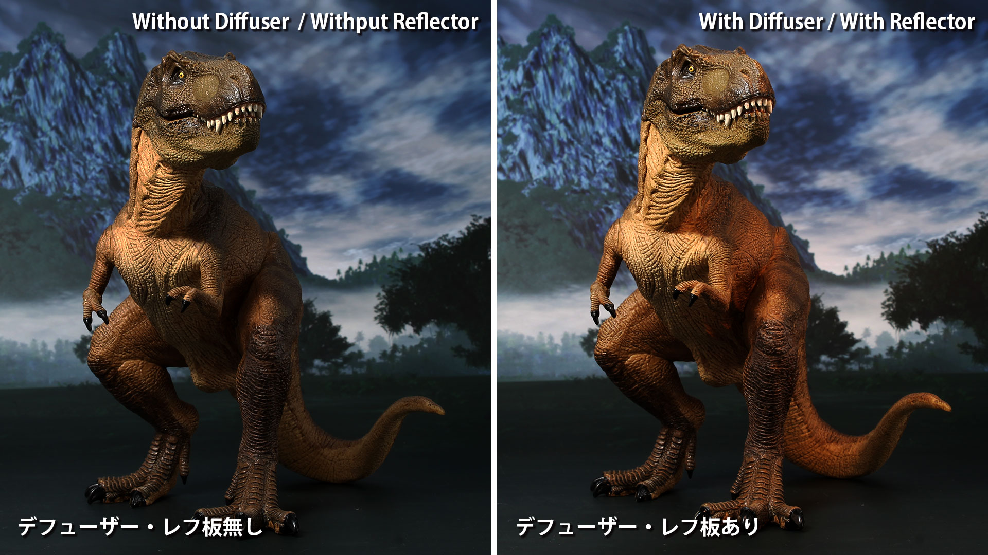 以上、デフューザーとレフ板を用いた利用方法のご紹介でした。利用例の写真を見ても分かる通り、デフューザーやレフ板を使用しないでコントラストをクッキリ出す手法も、もちろん有効です。コントラストの強いインパクトのある画像を求める場合、細かなディテールまでわかるように写したい場合など、利用シーンに応じてお好みで使い分けるのが良いでしょう。いずれにしましても、撮影する際にこうしたお手軽なTipsを知っていると、フィギュア撮影などを楽しむ際の幅が広がりますので、ぜひお試しください。色々と考え工夫することで、撮影することの楽しさも加わり、ホビーの楽しみがより深まります。