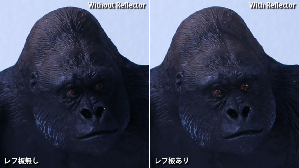 左がレフ板無し、右がレフ板有の比較写真です。顔の右半分が影で黒くつぶれてしまうのが輪郭まで認識できる違いがわかります。 |