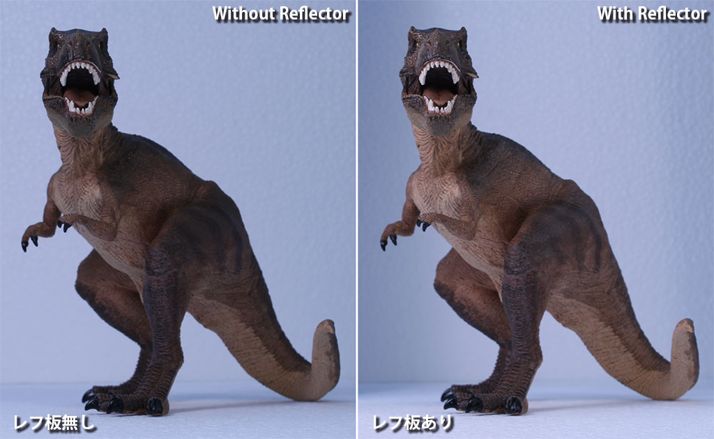 左がレフ板無し、右がレフ板有の比較写真です。体表部や口の中のディテールの違いが比較するとわかります。 |