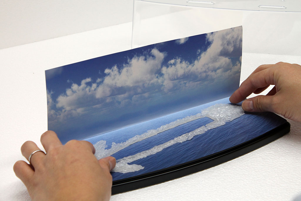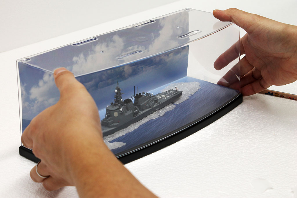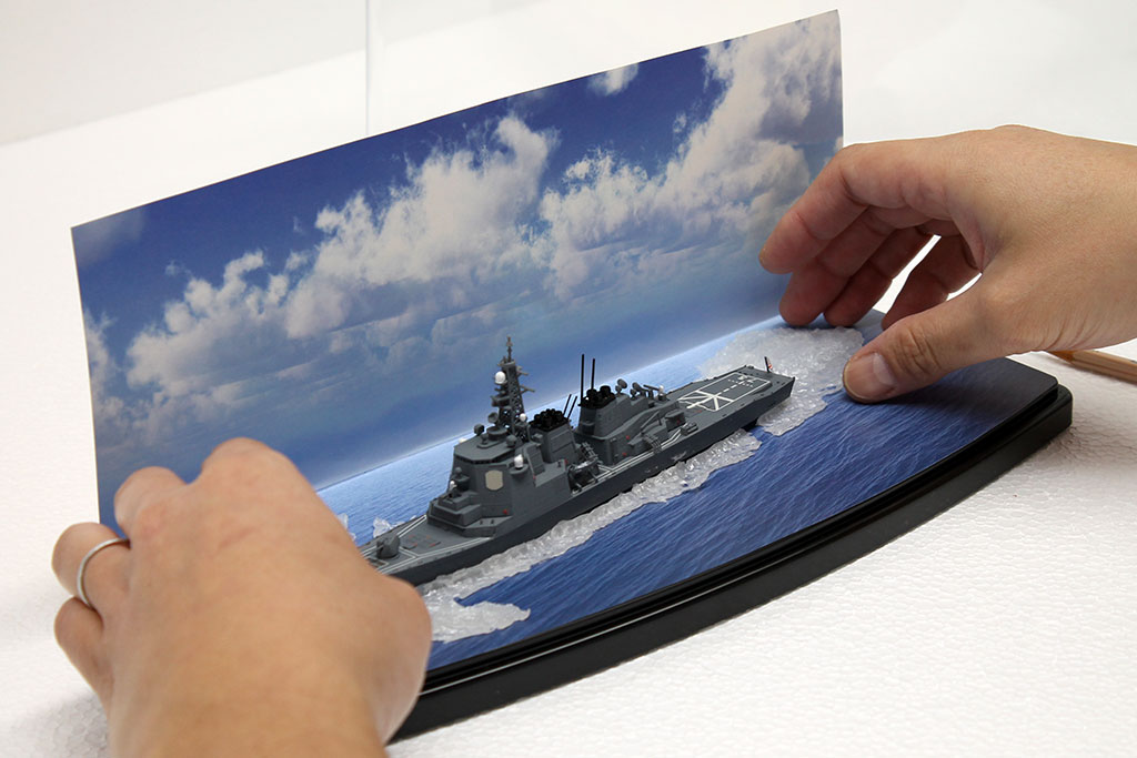 今回は艦船モデルを例に挙げてご紹介しましたが、ジオラマシートminiやジオラマシートを各種ディスプレイケースに設置する方法も基本的には同じです。小物などのアクセントを加えたり、背景部分の余りをケース内のサイドに貼り付けたりする方法も効果的ですので、思い思いのアイデアでご自慢のコレクション展示をお楽しみください。