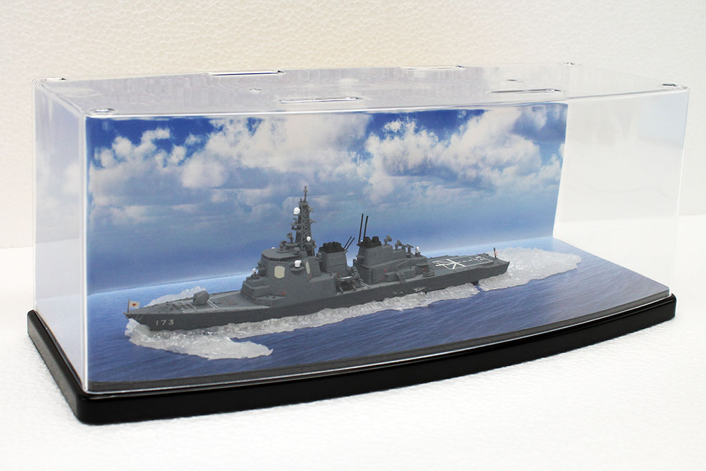 紹介例では、1/700のウォーターライン艦船模型(海上自衛隊イージス艦 こんごう)を使用しており、当サイトのTipsでもご紹介した航走波を設置しております。食玩サイズの艦船(1/1250や1/200)や1/700の中小型サイズ艦船でしたら、複数隻がセットでディスプレイ可能です。お手軽なディスプレイケースへの展示で、あなたのお気に入りのモデルコレクションをさらに効果的にお楽しみください。